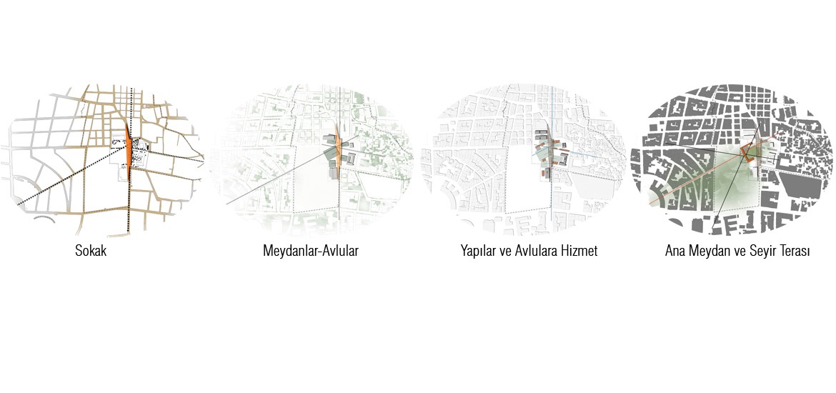 Güçlü sokak-yaya aksı, yaya aksına takılı geliştirilen avlular, avlular arası bağlar temel alınmıştır. Bu avlular ve