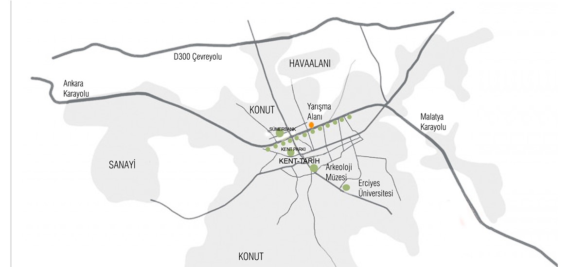 Yarışma alanı kent merkezine yakın olmakla beraber teğet bir ilişki içindedir. Arazinin güneyinde yoğun ve güçlü bir yol aksı (Kocasinan Bulvarı) , kuzeyinde ise Kayseri Havaalanı'na kadar uzanan düşük yoğunluklu yeni bir yapılaşma alanı bulunmaktadır. Gelecekte Malatya ve Sivas istikametinden gelip Ankara'ya devam eden ve arazinin kentle olan yaya ilişkisini zayıflatan Kocasinan Bulvarı'nın varlığını koruyacağını, arazinin kuzeyinde havalimanına doğru yapılaşmanın artacağını öngörebiliriz. Bu öngörü ile Kocasinan Bulvarı'nın trafik yoğunluğu göz önüne alınarak içe dönük bir yapı kurgusu ile tasarıma başlanmıştır.
