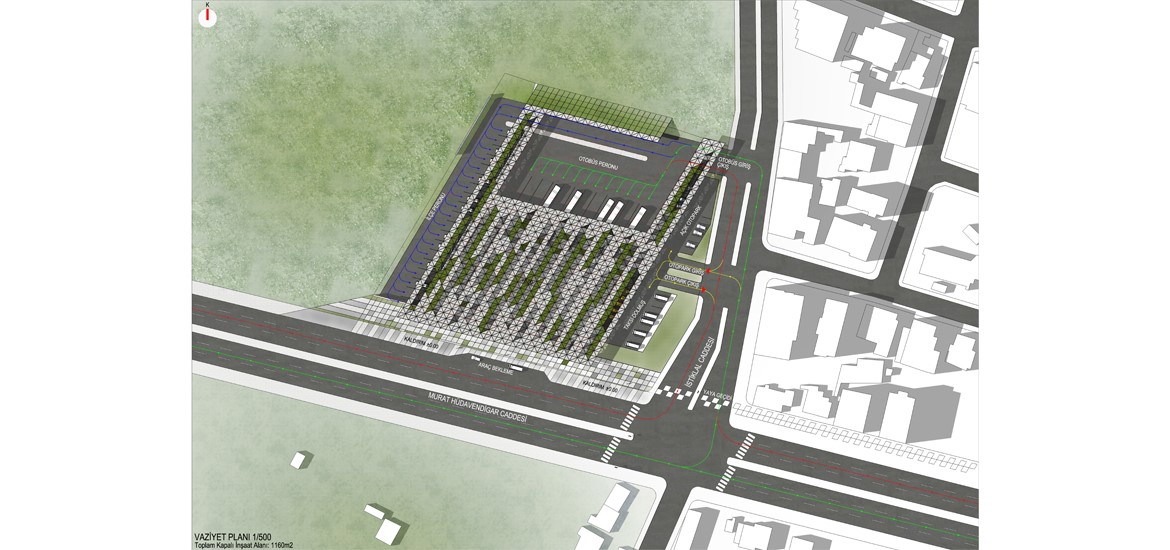 Bu durumda sınırlı yeşil alanların stadyum bölgesinde birleşerek bu alana kadar sürekliliği sağlanabilir. Böylece terminal yapısının gelecekte buradan taşınması durumunda bile, öneri saçağımız bu yeşil aksın içinde; panayır, festival, kent pazarı gibi işlevlerle yarı açık bir mimari eleman olarak hayatına devam edebilir.